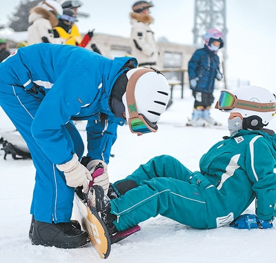 在黑龍江省哈爾濱市亞布力滑雪旅游度假區(qū),一名小滑雪愛好者(右)在大人的幫助下穿上雪板。
