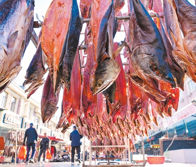 冬季的東極魚市,不僅能購買到種類繁多的冷水魚類制品,還可領(lǐng)略“萬物皆可凍”的東北民俗。因此,這里也成為游客來到撫遠(yuǎn)后必去的“打卡地”。