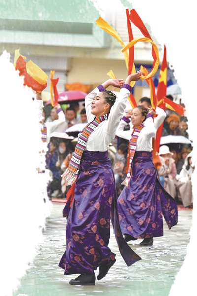春節(jié)假期,每到傍晚時分,四川省阿壩藏族羌族自治州若爾蓋縣城中心的北上廣場都會準時響起歡快的鍋莊曲,遠道而來的游客與當?shù)厝罕娨黄鹛饸g快的鍋莊。伴著音樂,鮮艷的長袖在風(fēng)中劃出道道弧線,腰飾隨著舞步搖曳,男女老少圍成一圈、翩然起舞。