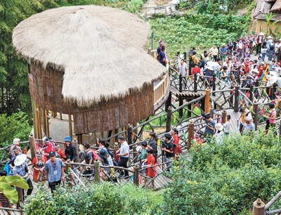 游客在東弄村沿步道前行,欣賞畬族民俗表演。