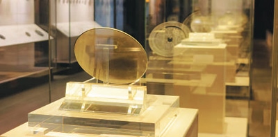 安徽蚌埠市博物館展出的漢代銅鏡。透過這枚銅鏡當前的狀況,依稀能見到過去鏡面光可鑒人的效果。