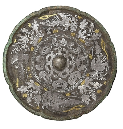 在金銀交相輝映下,這面銅鏡時至今日依然流光溢彩,其奧秘就在于“金銀平脫”工藝。即用金銀薄片裁成紋樣,粘貼于銅器漆面上,周邊再用漆涂滿,經研磨拋光再鏨花,形成富麗堂皇、精麗雅致的藝術效果。它從最早出現(xiàn)于商代的金銀箔貼花技術演變而來,后經歷了戰(zhàn)國、漢代較長時期的發(fā)展。到了唐代,工匠將“金銀平脫”創(chuàng)造性地運用在銅鏡之上。