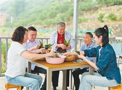 門上掛著艾草。院壩上,外公外婆淘洗著糯米,等候多時(shí)的老人見到孩子,臉上溢出笑容。母親停下手上的活兒,喚梅曉莉坐到一起。