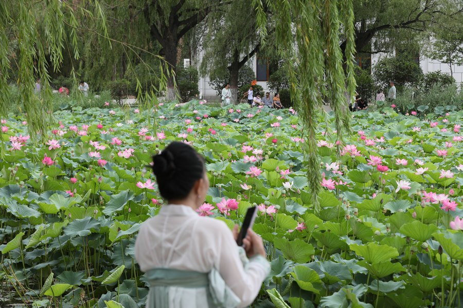 7月30日,呼和浩特青城公園的荷花進入最佳觀賞期,吸引眾多游人前來打卡。