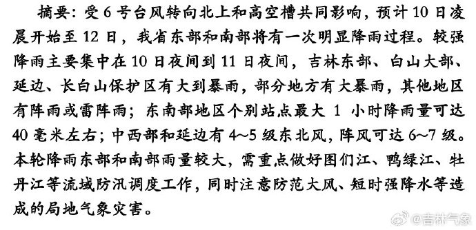 央視網(wǎng)消息:據(jù)@吉林氣象 微博消息,受第6號臺風(fēng)“卡努”轉(zhuǎn)向北上和高空槽共同影響,預(yù)計(jì)10日凌晨開始至12日,吉林省東部和南部將有一次明顯的降雨過程。較強(qiáng)降雨主要集中在10日夜間到11日夜間,吉林市東部、白山市大部、延邊州、長白山保護(hù)區(qū)有大到暴雨,部分地方有大暴雨,其他地區(qū)有陣雨或雷陣雨;東南部地區(qū)個別站點(diǎn)最大1小時降雨量可達(dá)40毫米左右;中西部和延邊州有4~5級東北風(fēng),陣風(fēng)可達(dá)6~7級。本輪降雨東部和南部雨量較大,氣象部門提醒,需重點(diǎn)做好圖們江、鴨綠江、牡丹江等流域防汛調(diào)度工作,同時注意防范大風(fēng)、短時強(qiáng)降水造成的局地氣象災(zāi)害。