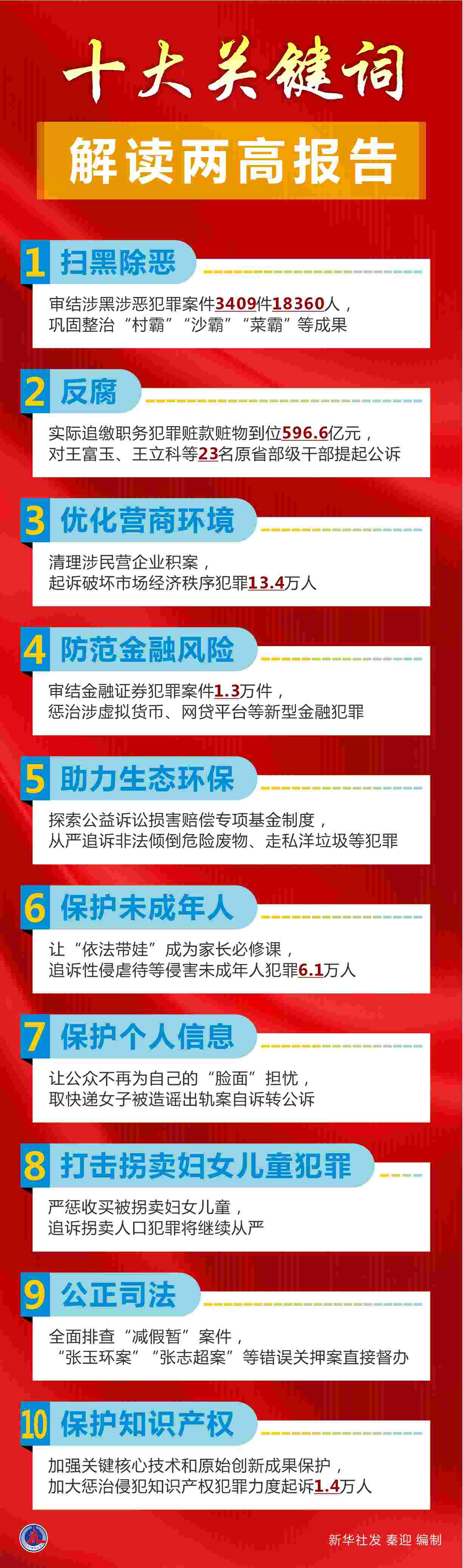 兩高報(bào)告凸顯依法治國的決心與力度。點(diǎn)名秦光榮、王富玉、王立科等落馬腐敗分子,提及陶革涉黑案、張玉環(huán)案、取快遞女子被造謠出軌案等引發(fā)社會關(guān)注的案件。常態(tài)化掃黑除惡、高壓反腐、打擊拐賣婦女兒童犯罪、保護(hù)公民個人信息等法治重點(diǎn),與群眾關(guān)切高度契合。