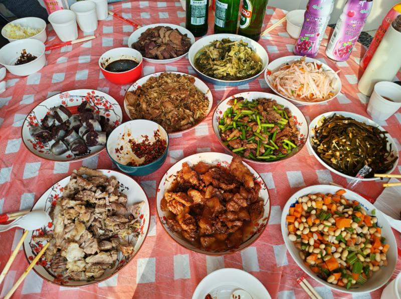 忙活了一上午,紅白相間的桌布上各類菜品早已擺得滿滿當當,除了位居主位的殺豬菜,還多了許多“衍生作品”:醬燜肉、汆白肉、蒜苔炒肉、酸菜炒肉、涼拌豬肝、豬血腸、涼拌海帶條、芥菜絲……圍坐一圈的不止家人,還有左鄰右舍。無需主人過多招呼,筷子便紛紛探向鍋中。窗外寒風漸歇,霧氣也被陽光驅(qū)散,而在溫暖的屋子里,鍋氣蒸騰,模糊了窗上的冰花,也潤濕了每一雙帶著笑意的眼睛。這不僅僅是一頓飯,更是鄉(xiāng)里鄉(xiāng)親們對生活最熱烈的擁抱。