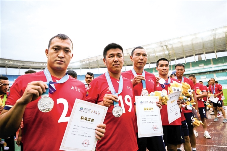 7月26日,內蒙古隊球員展示銀牌。當日,第十四屆全國運動會群眾比賽足球項目十一人制男子農村鄉(xiāng)鎮(zhèn)組決賽在大雨中開戰(zhàn)。最終經(jīng)過90分鐘的爭奪,代表內蒙古出戰(zhàn)的錫尼河鎮(zhèn)隊與陜西隊戰(zhàn)成1:1平,在隨后進行的點球大戰(zhàn)中,內蒙古隊2:4不敵對手,獲得該項目的亞軍。(攝影/北方新報正北方網(wǎng)記者 牛天甲)